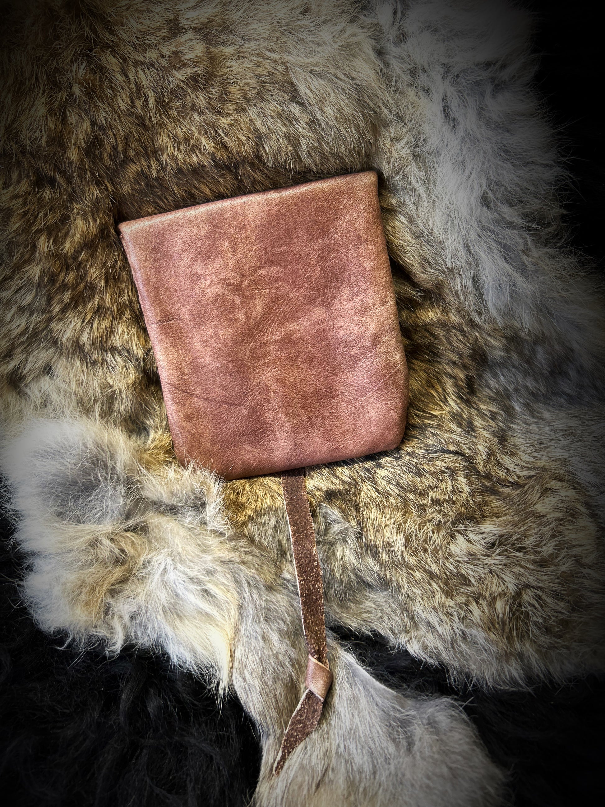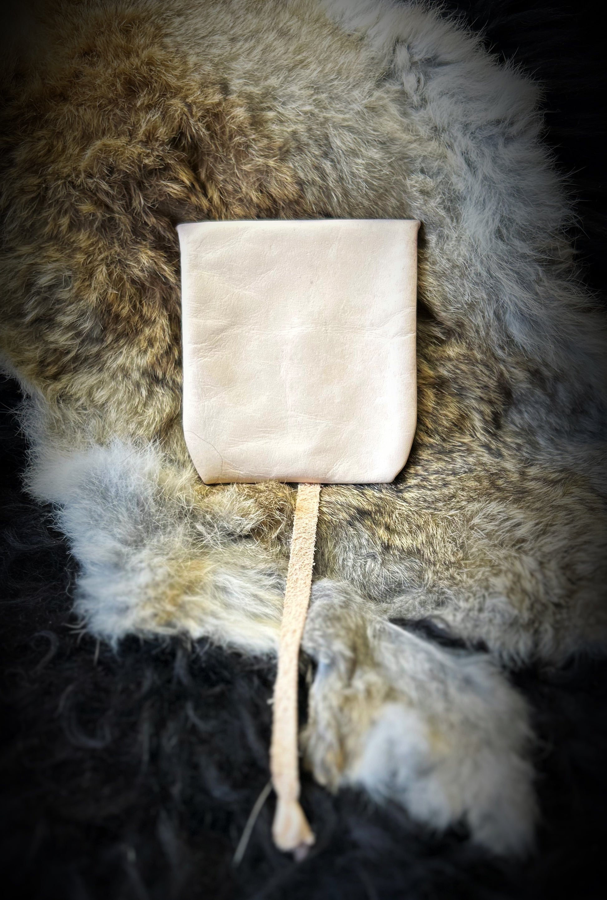 Handmade from natural Veg-Tanned Leather. The main body is constructed using a single piece of veg tanned leather, hand sewn up both sides using a waxed linen thread, and the turned right side out. The lace is then sewn on by hand and tied in a rough knot on the end. this prevents the pouch from opening fully, keeping your valuables safe and secure. The pouch is roughly 1200x1200mm.